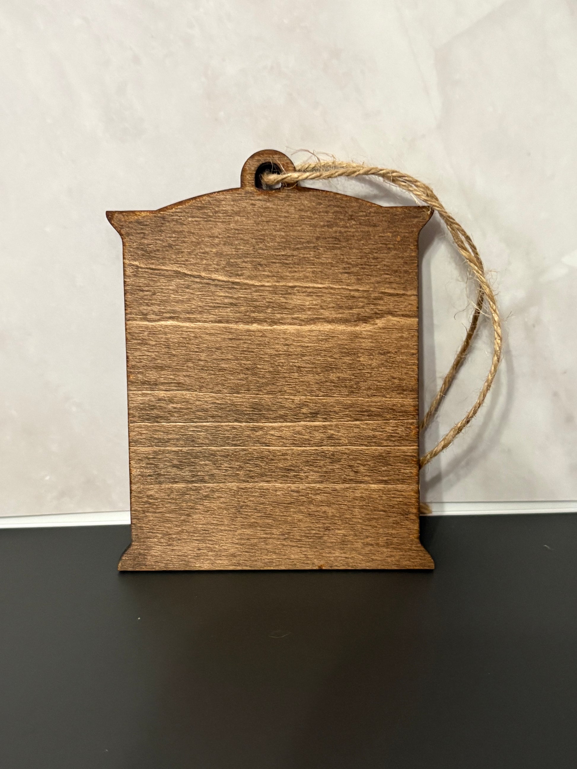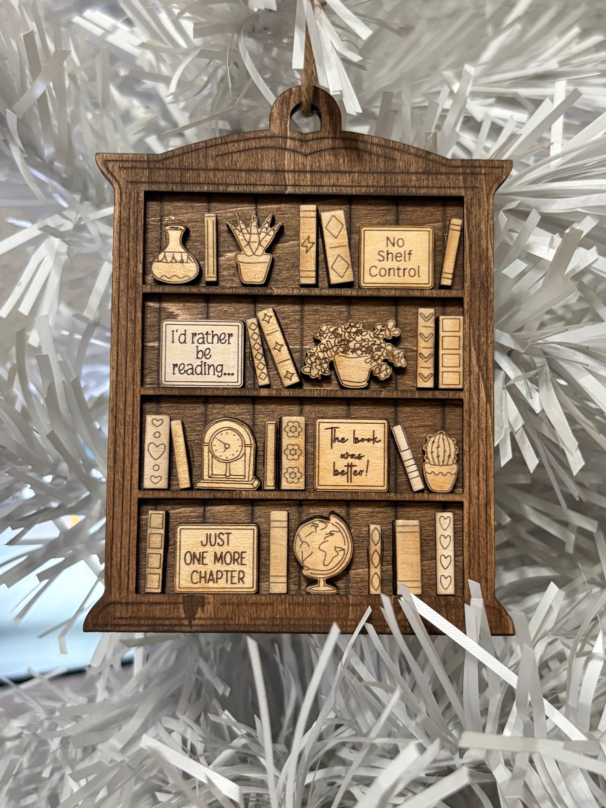 Laser engraved and cut bookshelf ornament. Stained and glued by hand.