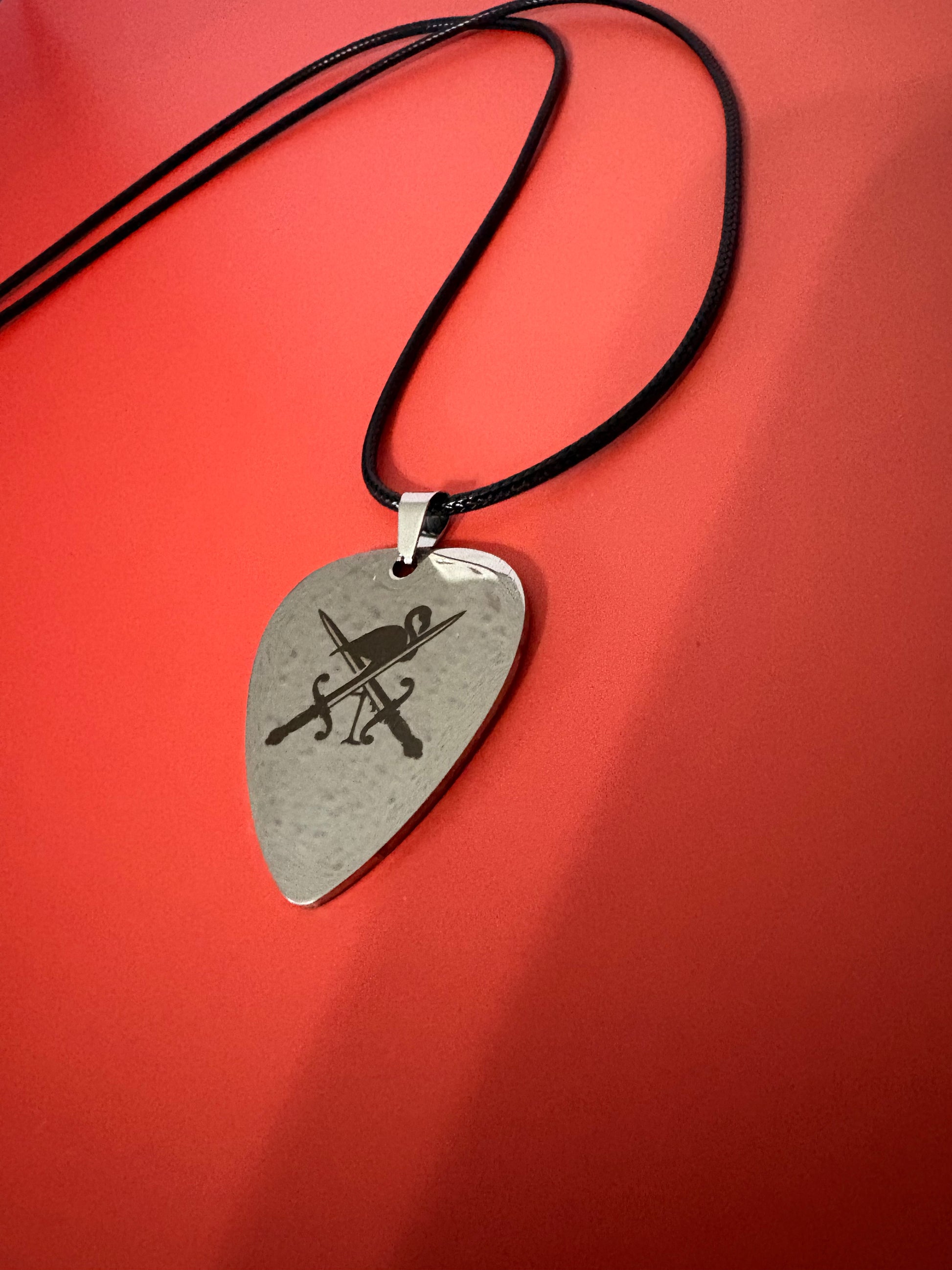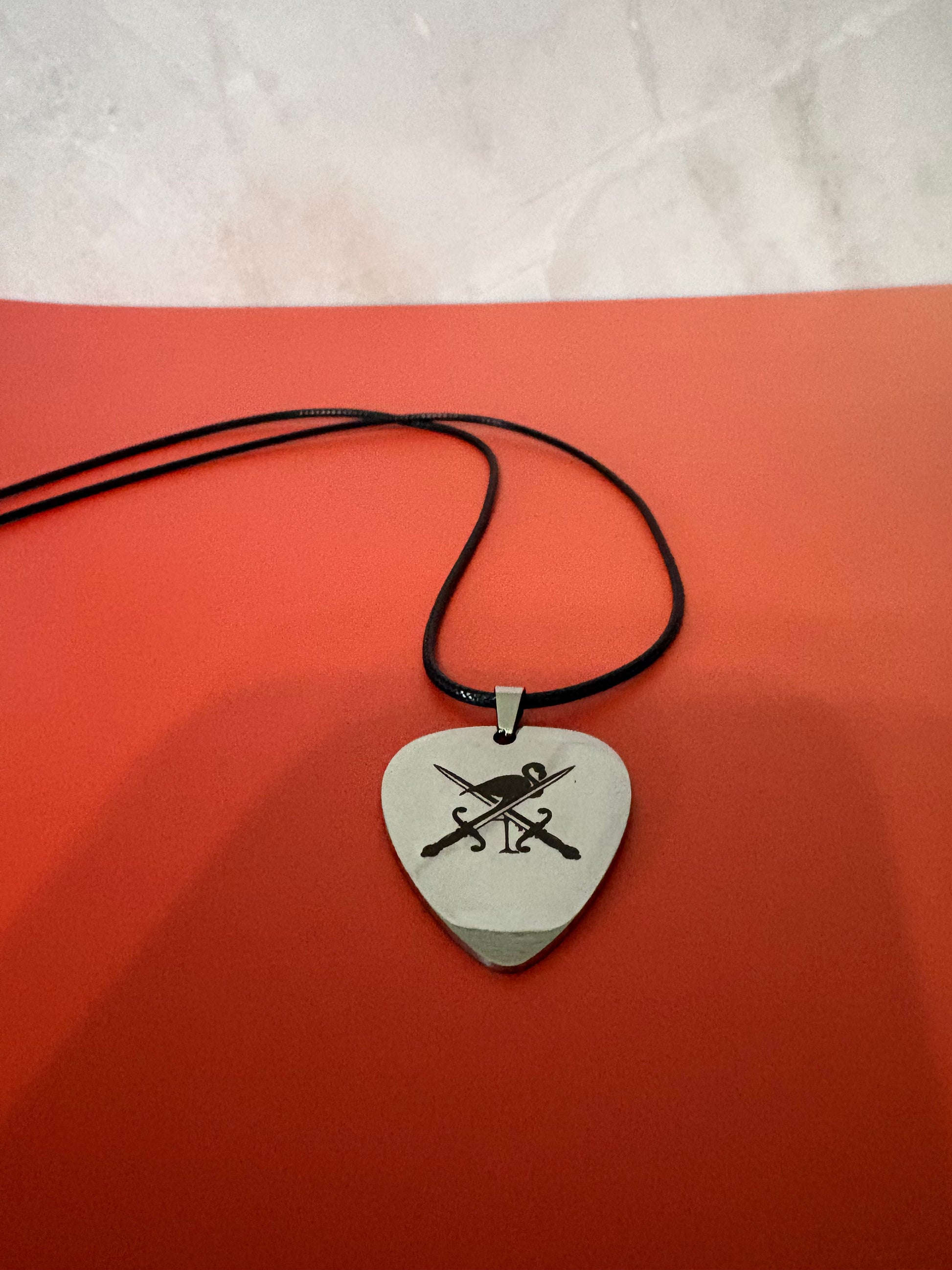 Laser engraved flamingo and sword necklace with black cord and clasp