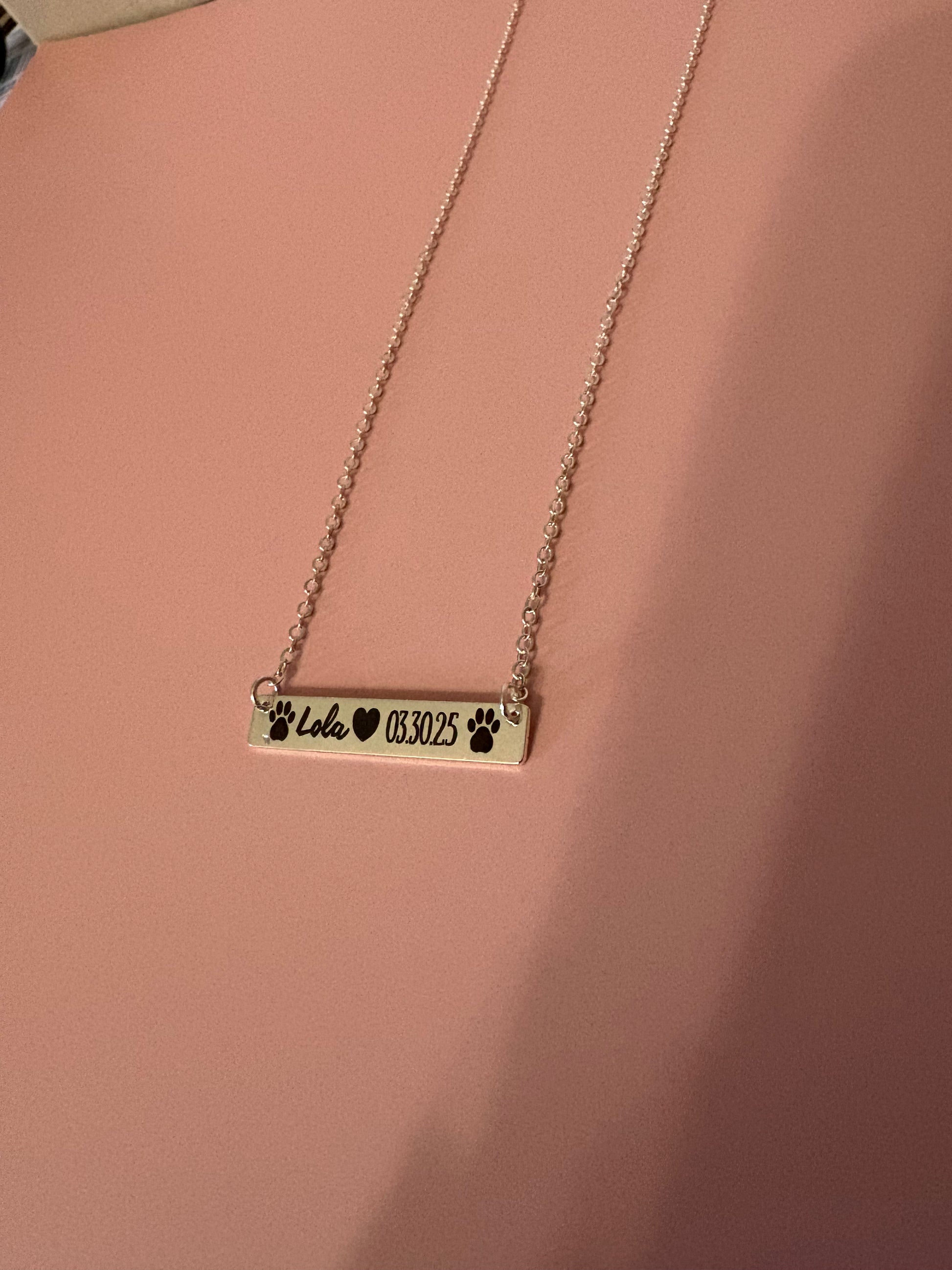 Personalized Pet Name Necklace • Custom Pet Birthday or Adoption Date • Dog Mom Jewelry • Paw Print Bar Necklace • Pet Memorial Gift